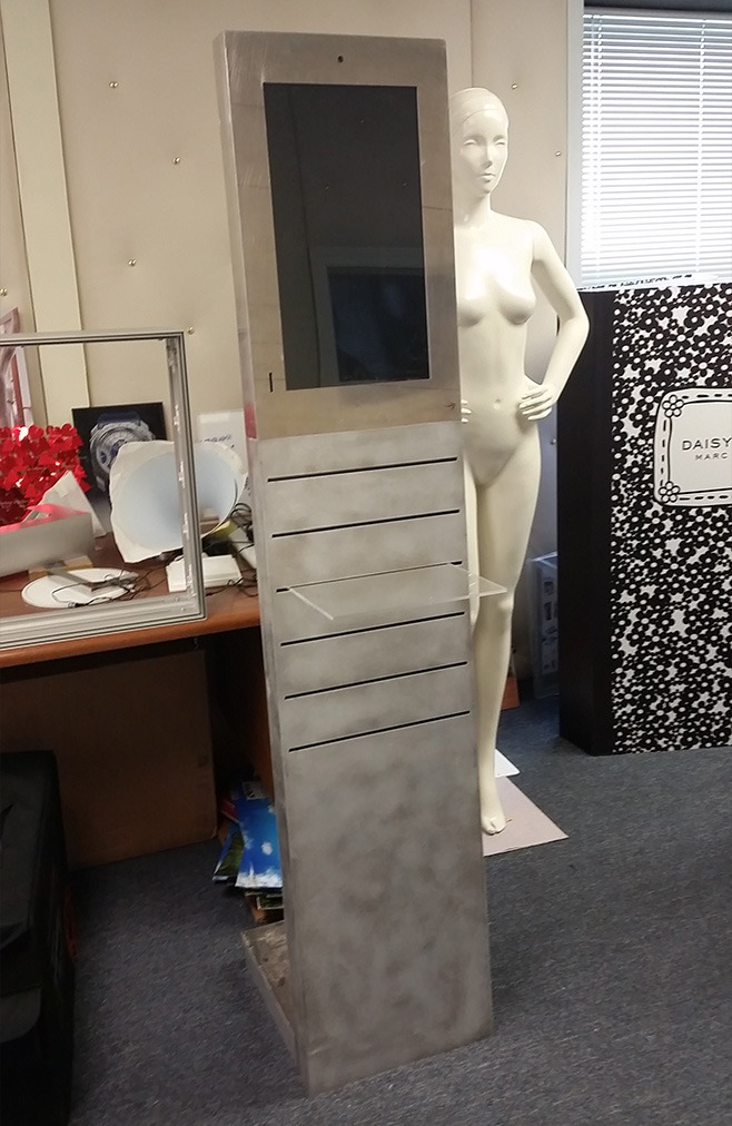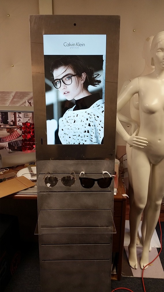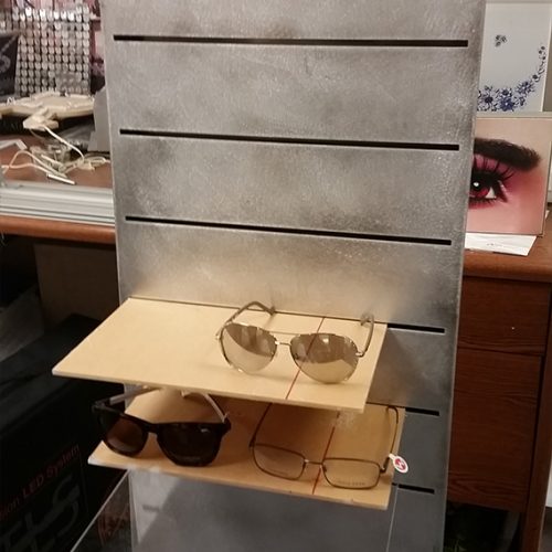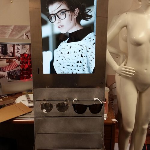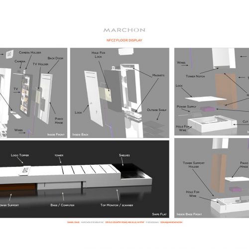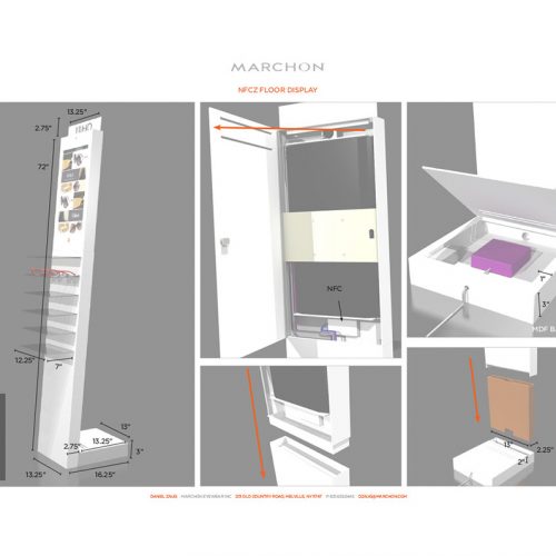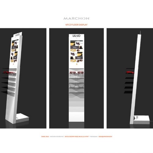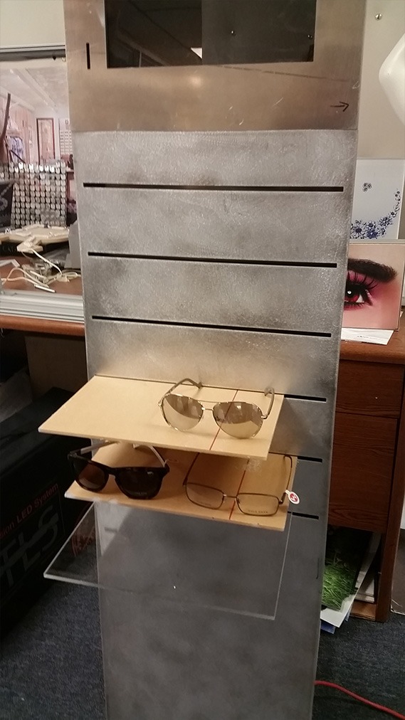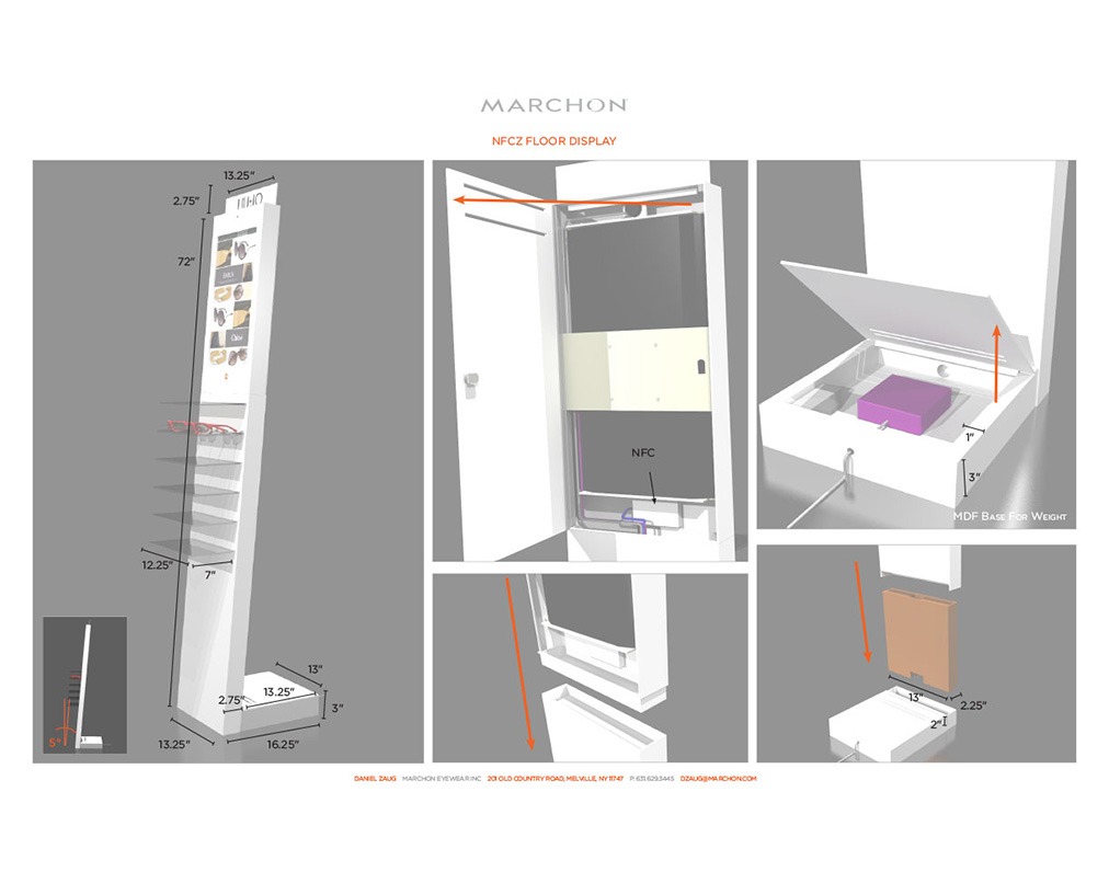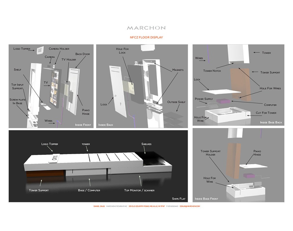 Daniel Zaug received a lot of positive feedback on the large NFCZ unit at the Vision Expo and decided to create a smaller instore unit. One unit was designed to fit onto a standard eyewear frame board. The second was designed as a compact unit that disassembled into three pieces to ship flat. All of the correct measurements were given to a vendor through his 3D renderings to produce the exact design.
